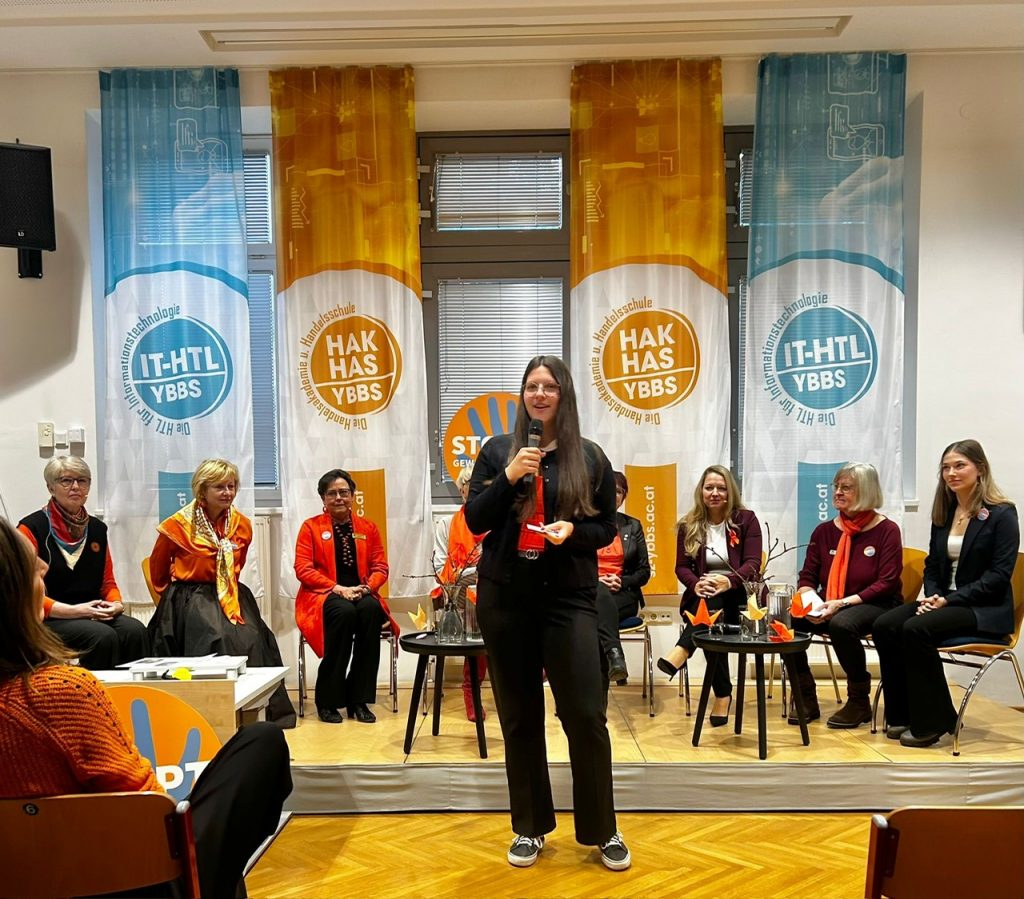 Im Aktionszeitraum von “Orange the World“ 16 Tage gegen Gewalt an Frauen fanden im Bezirk Melk wieder an unterschiedlichen Schauplätzen Veranstaltungen statt: In Ybbs wurde in der HAK/HAS Ybbs ein Runder Tisch organisiert. Der Kontakt zur Schule fand über die Teilnahme einer Schülerin am Redewettbewerb der österreichischen Union zum Thema „Frauen und Finanzen“ statt.